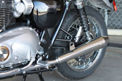 Designed for the liquid-cooled Triumph family. Thruxton, Thruxton R, Speed Twin 1200, Bonneville T120, Bonneville T120 Black, Bonneville T100, and the Speed Twin 900/Street Twin/Street Cup. Smaller and more compact than OEM or our Dominator series. The compact cone/reverse cone design bolts directly into place on your stock headers and mounting positions. With only a 15" overall length, the exhaust will end well in front of the rear axle and chain adjuster, making routine rear wheel maintenance much easier.